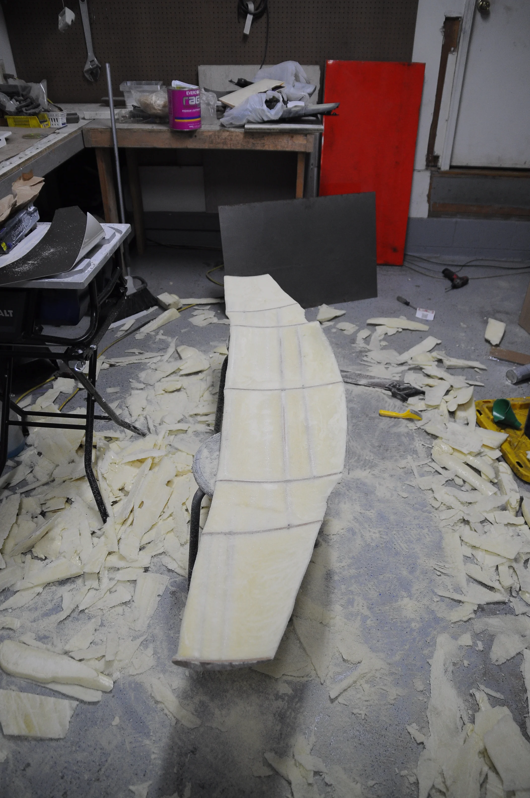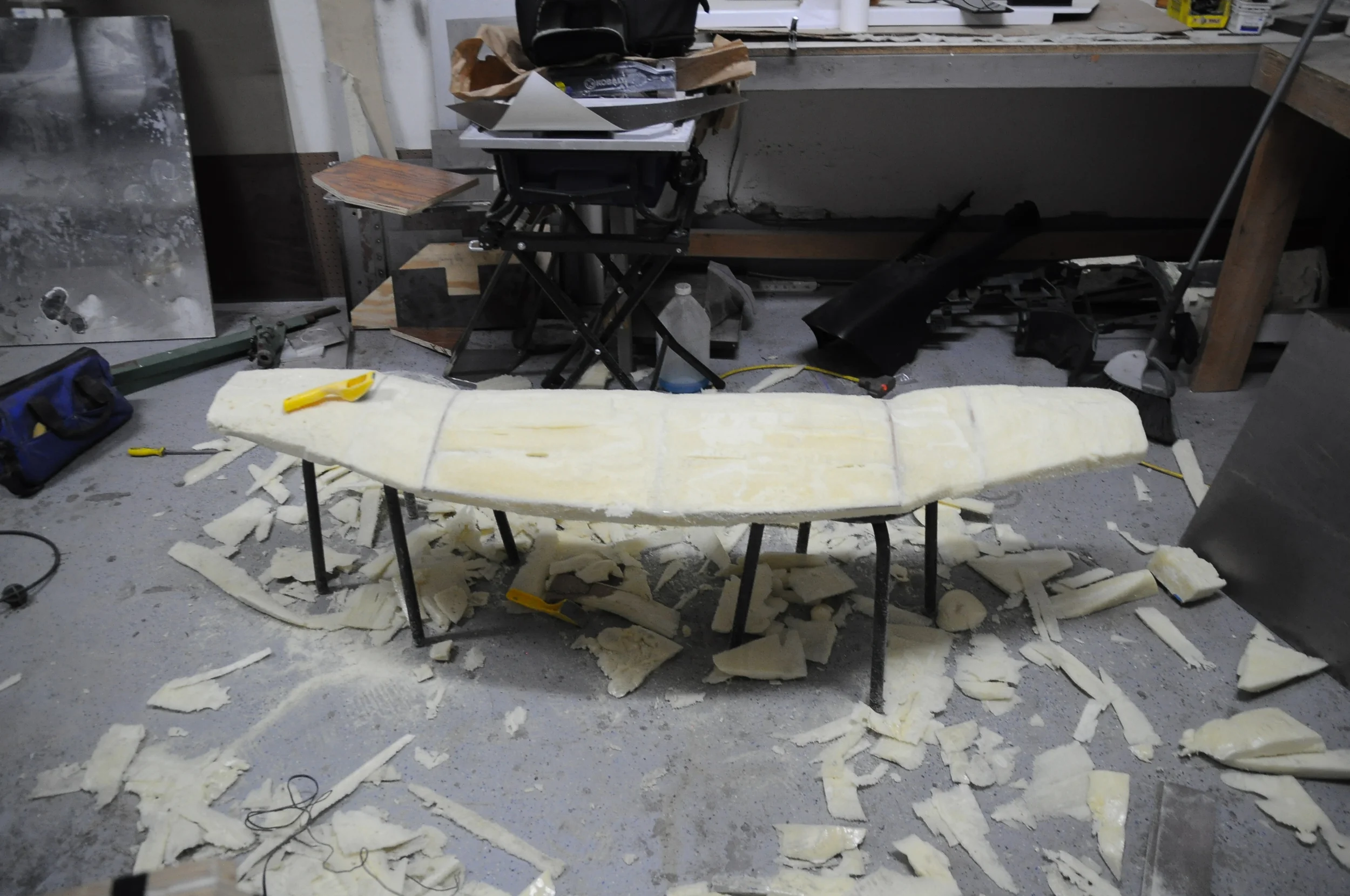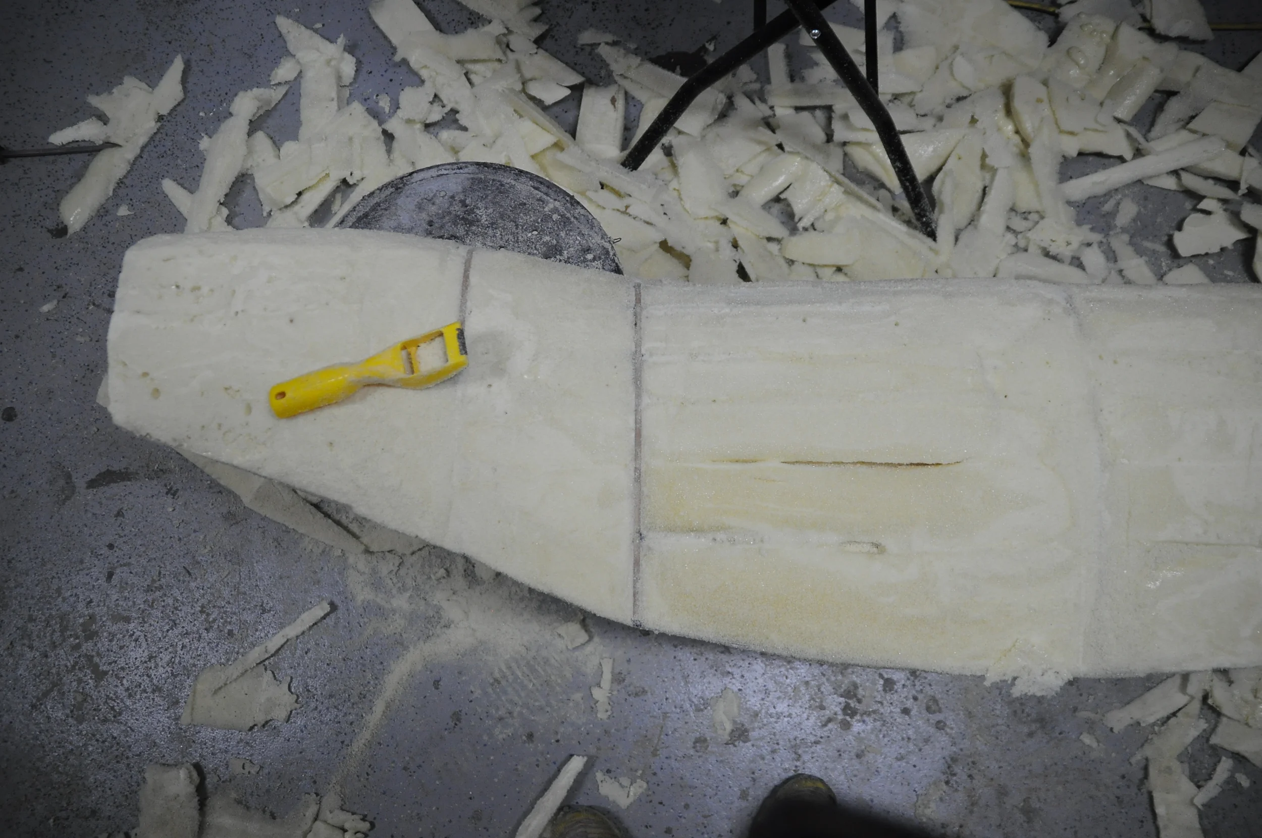 Next I began to rough out the shape with a saw and foam shaver. Typically a hot wire cutter would be the best tool to use at this point but the one I made was not working very efficiently (I think I need to replace the wire) and I don't think this foam cuts as easily as the insulation foam I used on the first prototype.