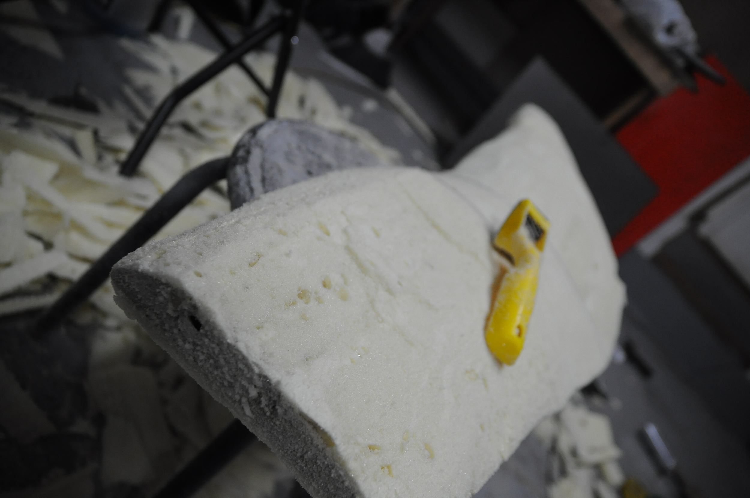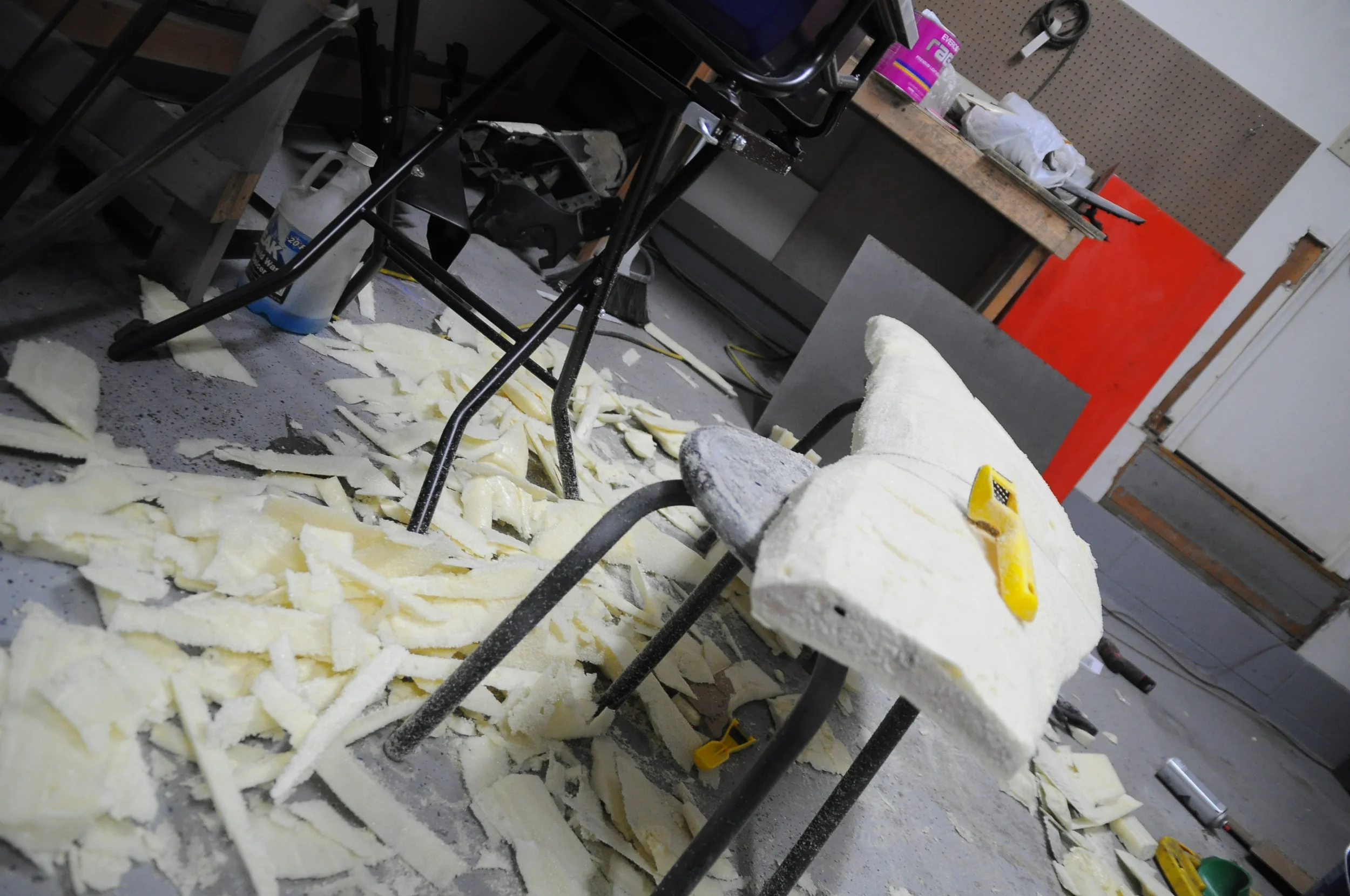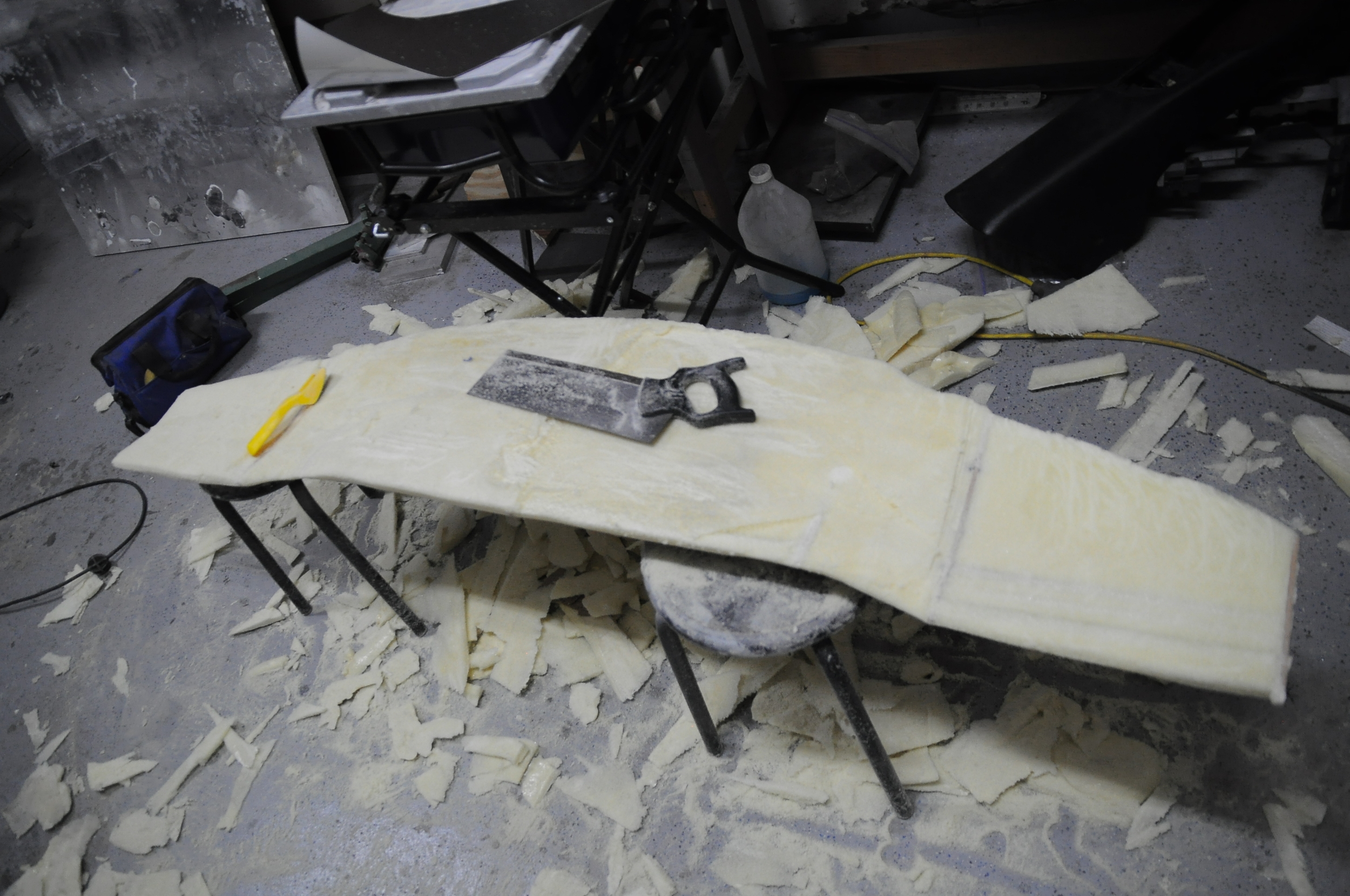 Next I began to rough out the shape with a saw and foam shaver. Typically a hot wire cutter would be the best tool to use at this point but the one I made was not working very efficiently (I think I need to replace the wire) and I don't think this foam cuts as easily as the insulation foam I used on the first prototype.