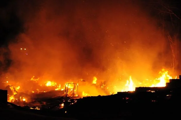 The structure appeared to be a storage building according to a witness at the scene. Measurements made in Google Maps indicate the building is over 300 feet long and about 40 feet wide, approximately 100 feet of it had been consumed by the fire. There is also another building right next to it about the size of a small house.